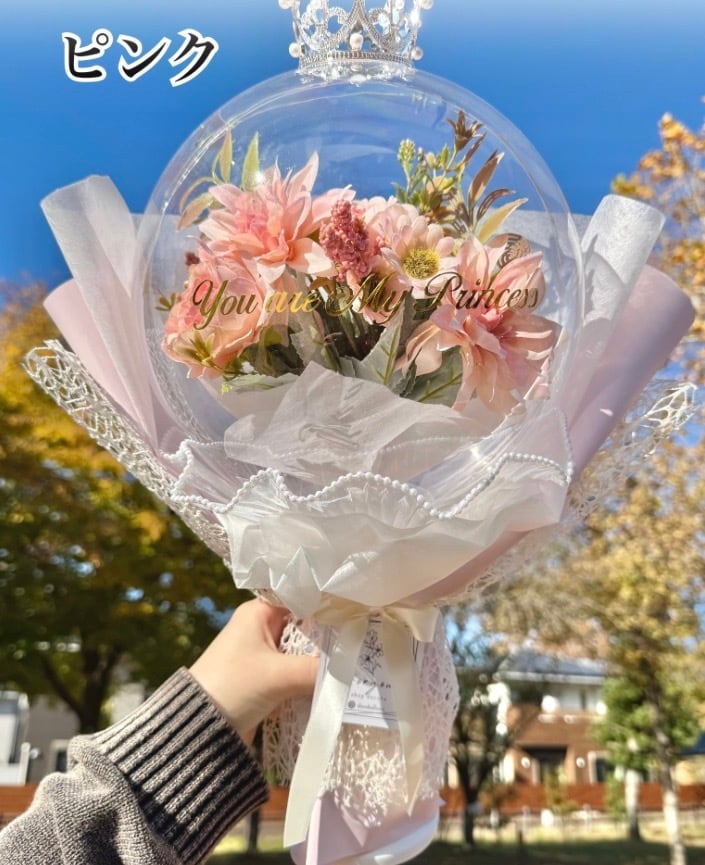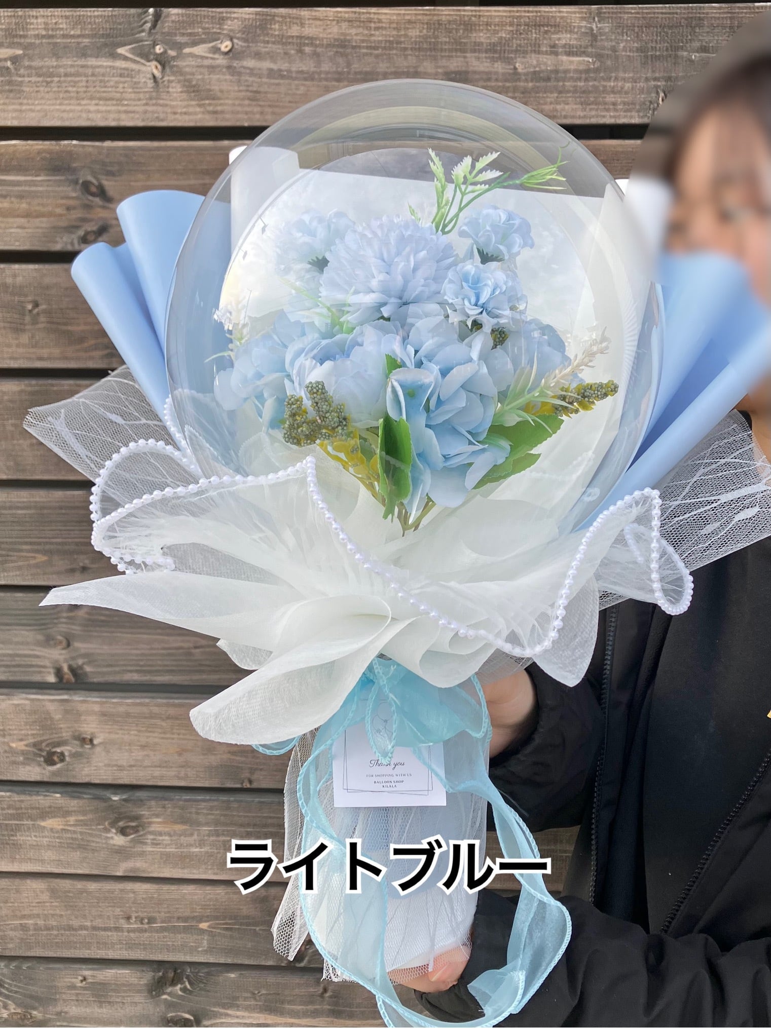 透明バルーンの中にお花(アーティシャルフラワー)を閉じ込めたバルーン花束風♪