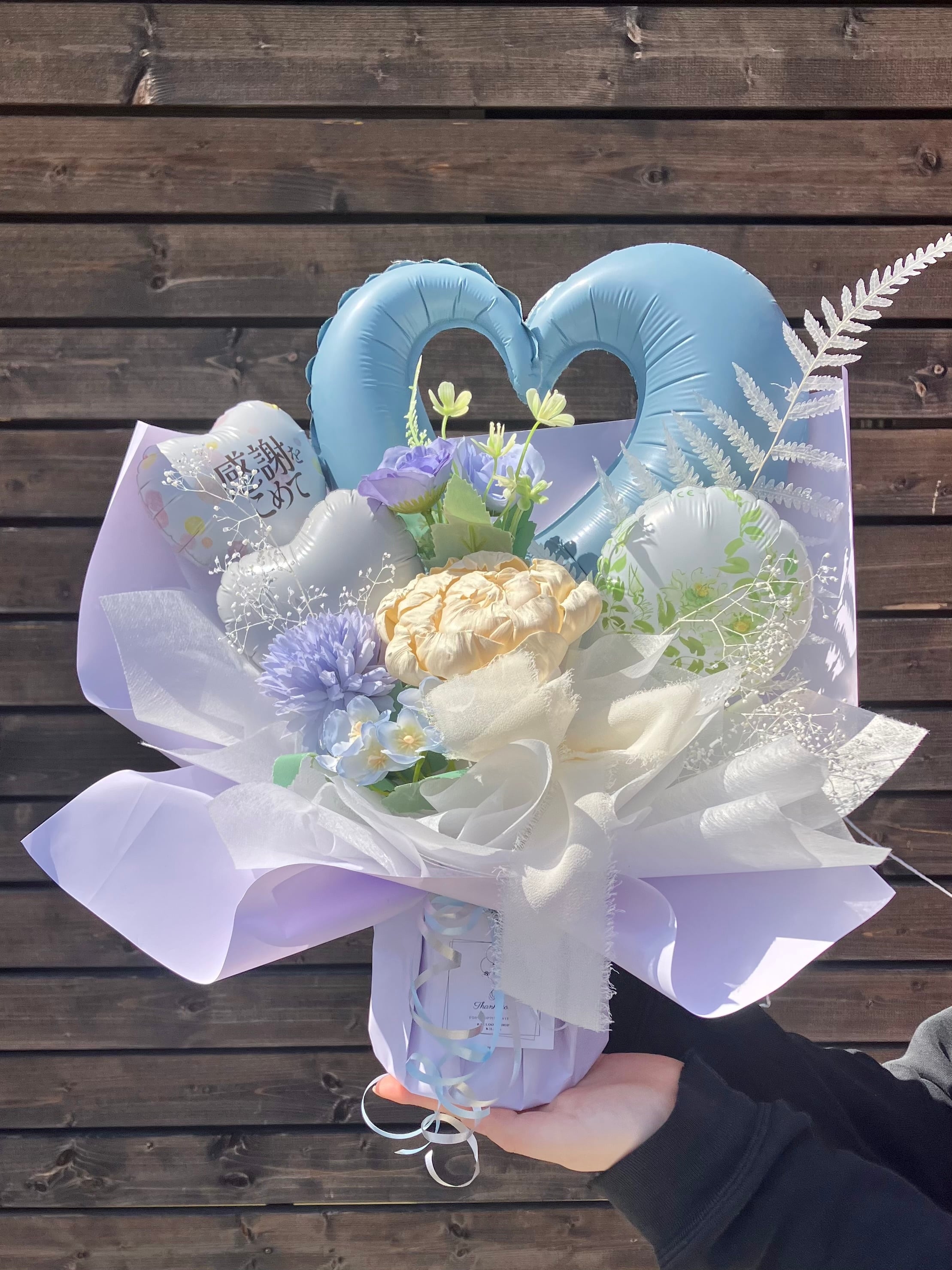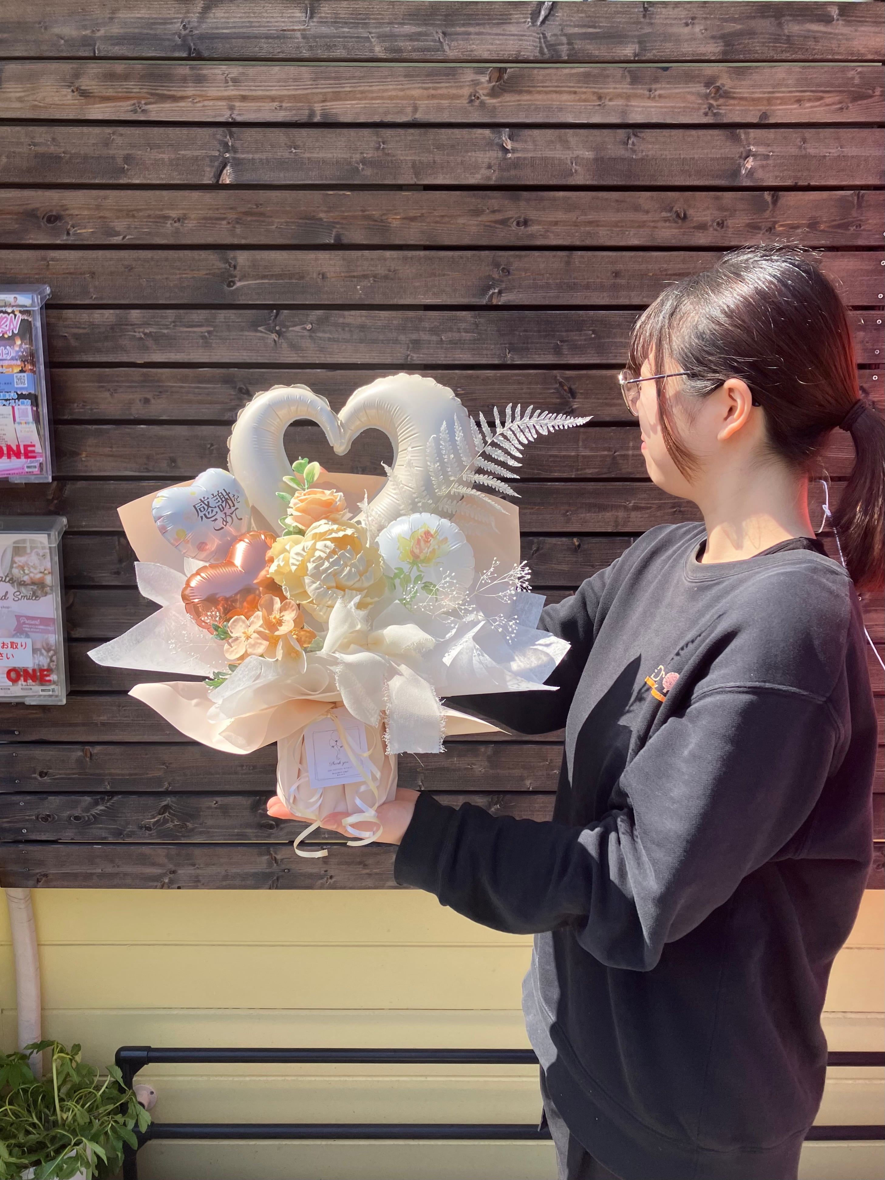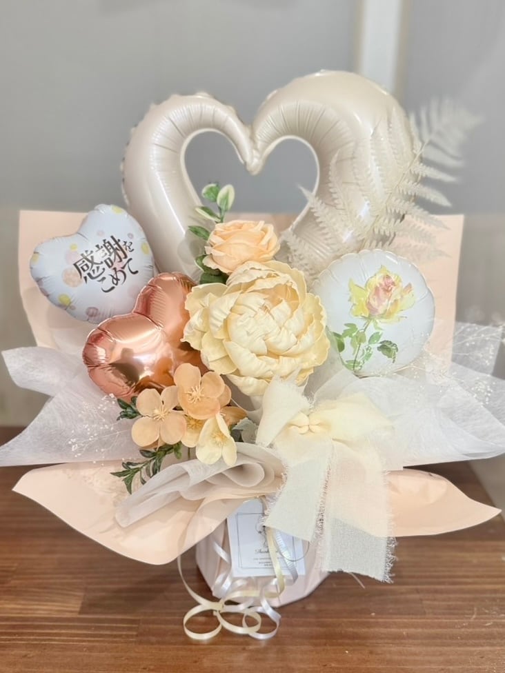 アレンジ内で使用しているバルーン以外のアーティシャルフラワーやリボンなどは仕入れ状況によりイメージを変えない程度に変更となる場合もございます。