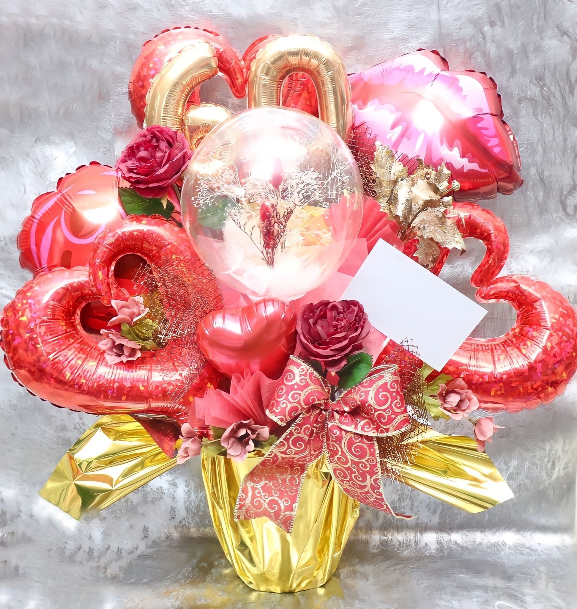 画像は還暦のお祝いで作成しましたがその他の祝いの場合、数字バルーン60を無くしてパンパスグラス2本となります。